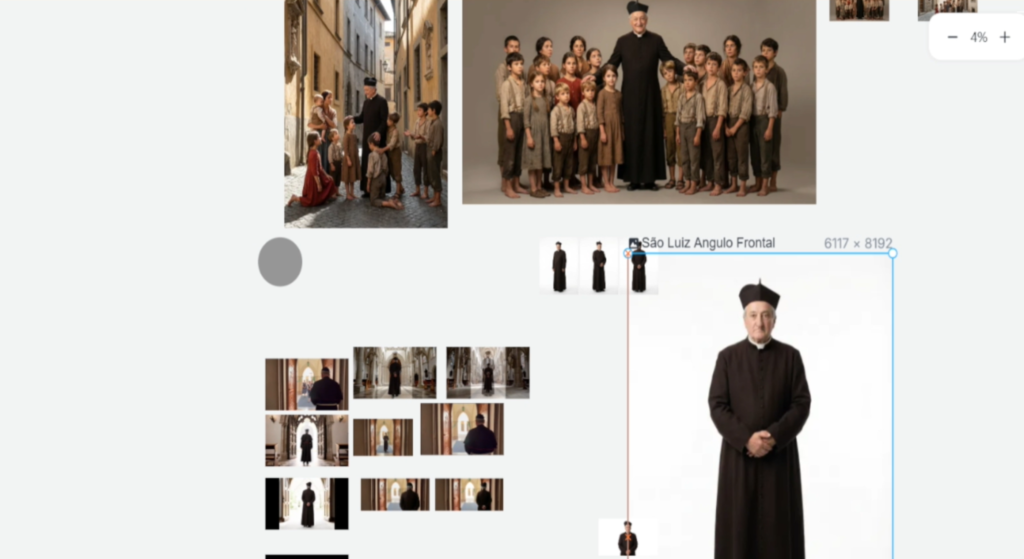 Alguns cenários foram inspirados em locais reais ligados à história da congregação, como igrejas e jardins. A partir dessas referências, as imagens foram recriadas com o auxílio de inteligência artificial, respeitando elementos reais sempre que possível.